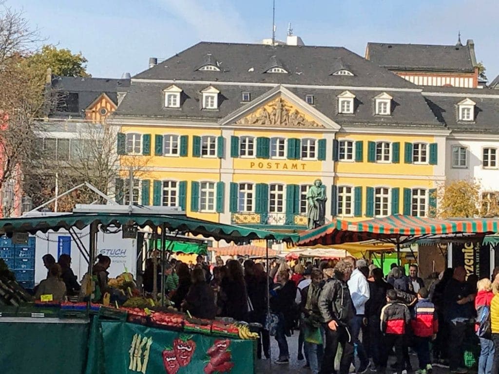Gestern ging es dann richtig los. Ich habe auf dem Ökomarkt am Bonner Münster eingekauft, danach noch auf dem „normalen“ Wochenmarkt, der an diesem Wochenende ausnahmsweise auf dem Münsterplatz stattfand. Das sah sehr schön aus, aber die Verkäuferin am Blumenstand sagte, die Umsätze seien nicht so toll wie auf dem Marktplatz…